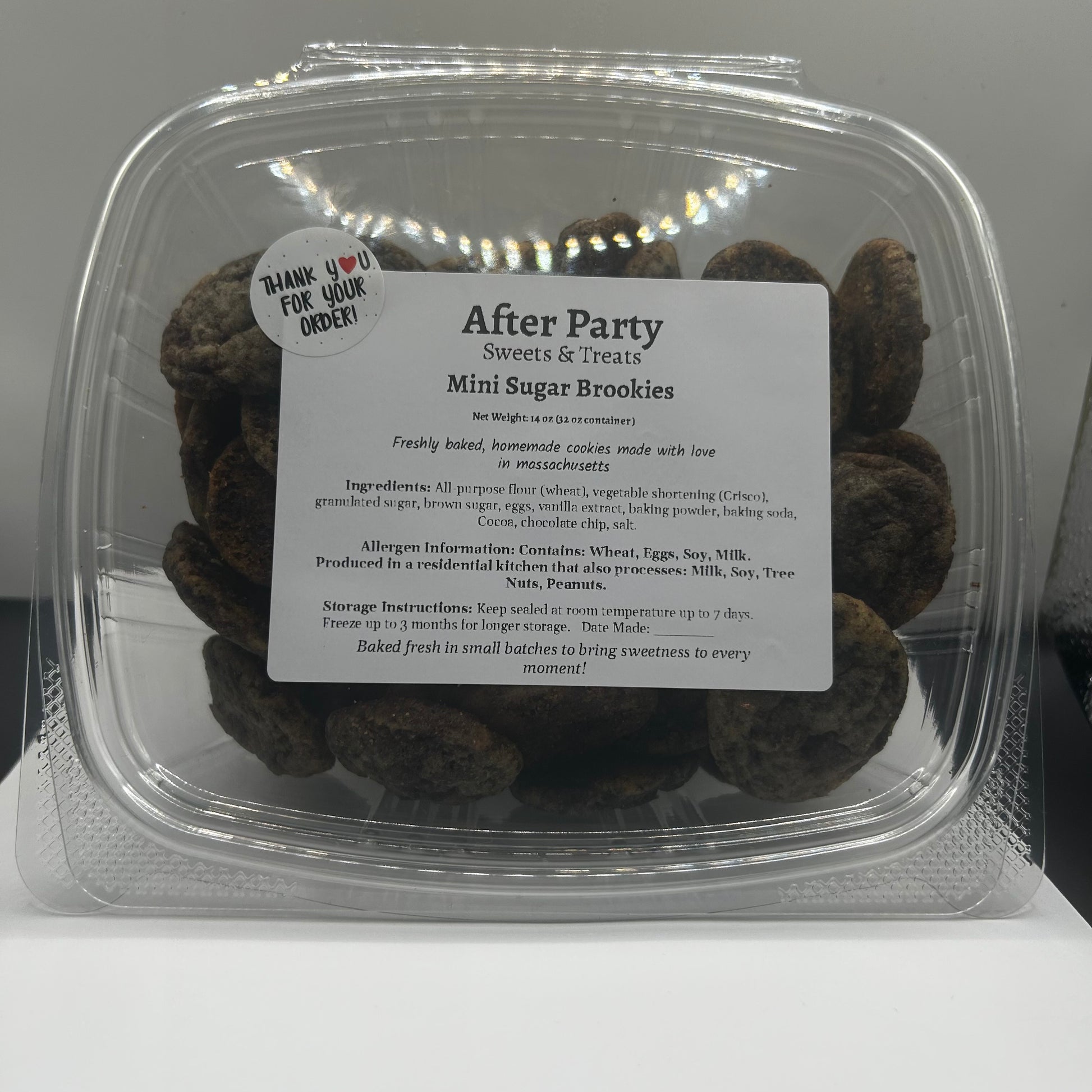 A delicious twist on two favorites — rich, fudgy brownie meets soft, sugar cookie! Each 32 oz container holds about 50 homemade mini cookies, perfectly bite-sized for snacking, sharing, or satisfying your sweet tooth anytime.